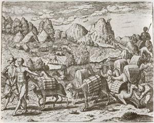 [1].- Llamas acarreando la plata de las minas de Potosí a la costa, con escolta armada, por los antiguos caminos de los incas. Grabado recogido del libro "Americae" de Théodore de Bry's (1602), sección de libros raros de la Biblioteca Pública de New York . [2].- Varón, Rafael. Minería colonial peruana: Un ejemplo de integración al sistema económico mundial. Historia y Cultura. Revista del Museo Nacional de Historia. Lima, 1978. N° 11.