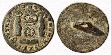 [1].- Botón de la colección de D. Antonio Callejón, Granada (España). [2].- Archivo del Museo Numismático del Banco Wiese. Lima. En adelante A.M.N.B.W. Botones de metal con figuración de plata con el sello de las monedas legítimas. Bando del Virrey. Lima, 1766. [3].- Medina, J.T. Ob cit. p.166. Transcribe la carta enviada por el rey sin indicar fecha. Se llamaba Pesetas a las piezas de 2 reales. [4].- Medina. ob. cit. p.166. |