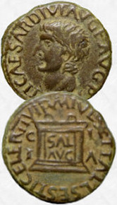 Cuños falsos, (inventados, la cabeza de Augusto laureada a izquierda no existe en este tipo de sestercios).