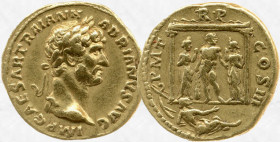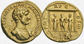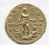 Existen seis tipos de áureos con el templo de Gades (RIC II 56-61), con diversas representaciones que incluyen, además de la figura de Hércules, desnudo, dentro de un templo y portando maza y/o manzanas (¿de oro?), a una divinidad acuífera (¿Océano?), dos figuras femeninas (¿Hespérides?), una cabeza frontal (¿máscara?), el busto de Júpiter, la proa de barco y un pez. Dividiremos estas monedas en dos grupos, según el número de columnas del templo: