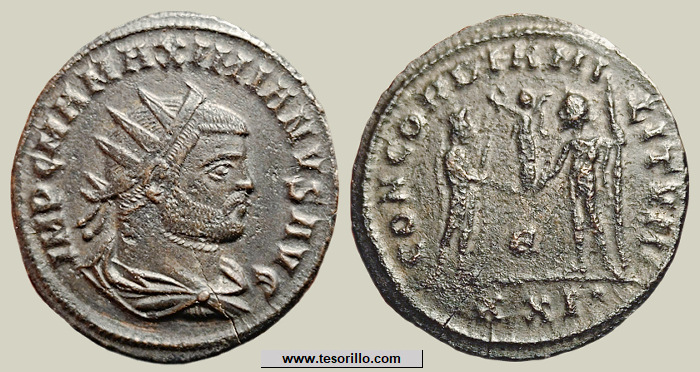 Anverso: IMPerator Caesar Marcus Aurelius VALerius MAXIMIANVS Pius Felix AVGustus