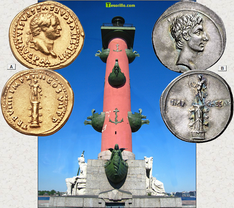 (Rusia) que antaño sirvieron como faros a la entrada del puerto, he colocado dos monedas romanas con sendas columnas rostrales. Estas columnas