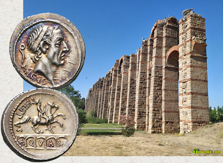 Reverso: Estatua ecuestre sobre acueducto (AQVA MARCIA) |