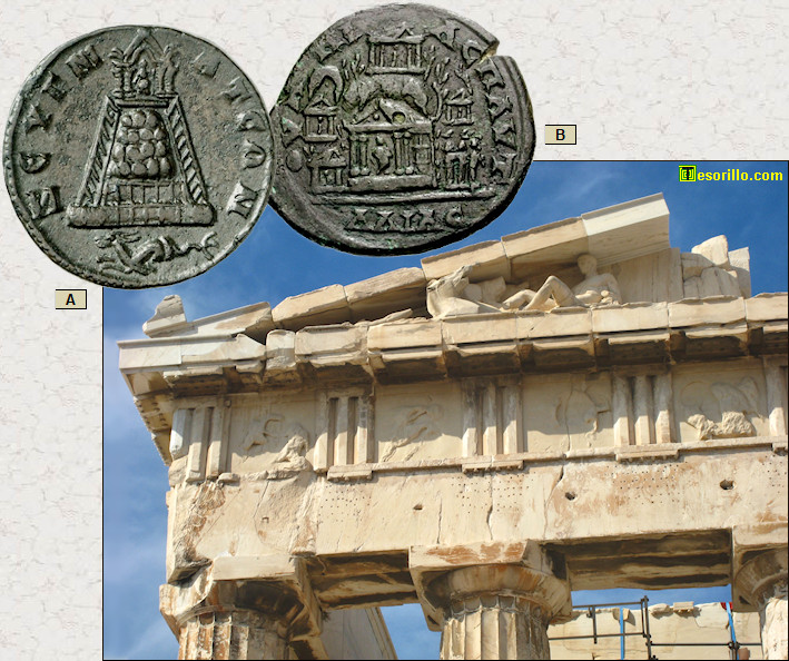 teatro de Segobriga (Saelices, Cuenca) he distribuido los reversos de seis monedas antiguas con interesantes representaciones arquitectónicas.