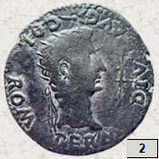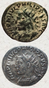 izquierda a derecha): una unidad de Carmo y un antoniniano de Filipo el Árabe (cuyas fotos