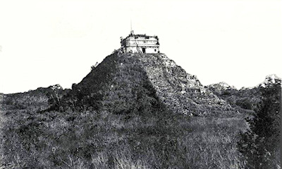 Izquierda: Fotografía de 1892 de las ruinas del templo de Kukulcán (Chichén Itzá, México).