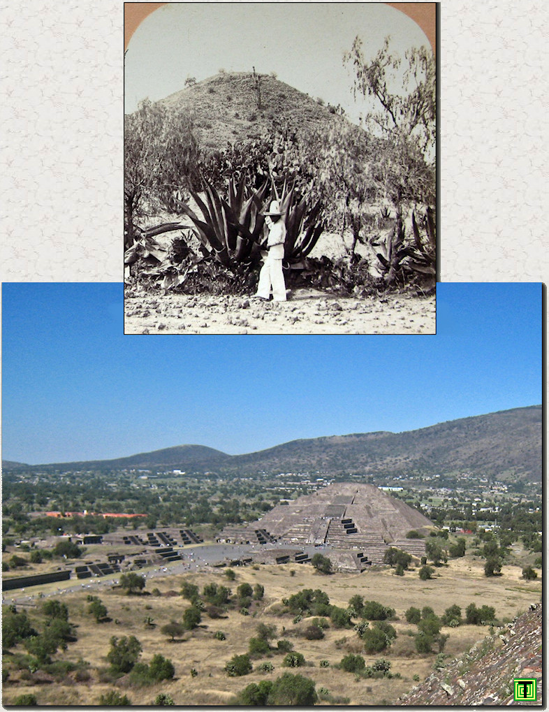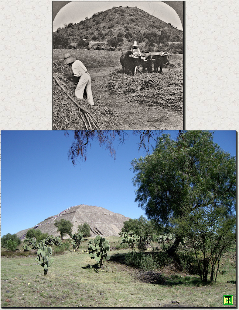 Izquierda: Pirámide del Sol a principios del siglo XX y en la actualidad (Teotihuacán, México).