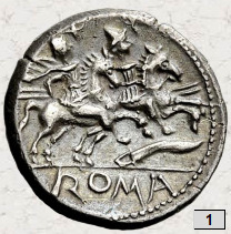 (moneda nº 1) con los Dioscuros y el símbolo falcata fue acuñado en Roma.