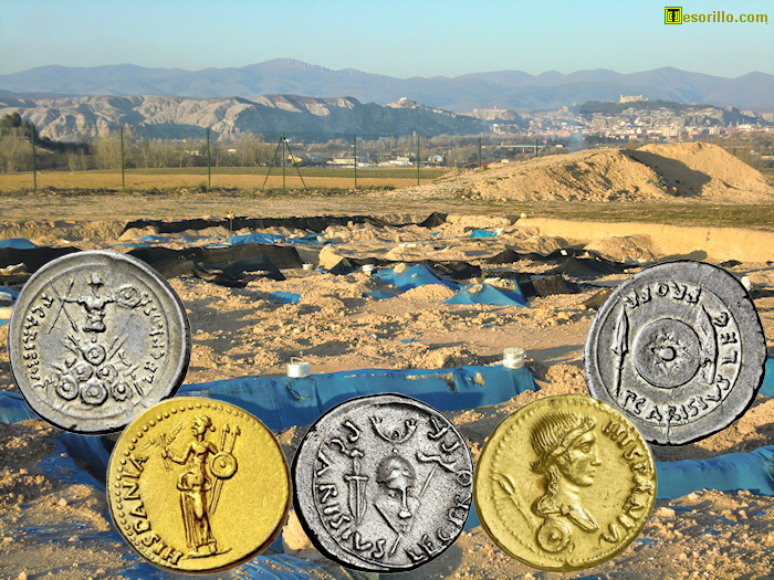 celtíbero de Valdeherrera, es decir, de la Bilbilis celtíbera de Calatayud (Zaragoza), he dispuesto cinco monedas romanas acuñadas en Hispania