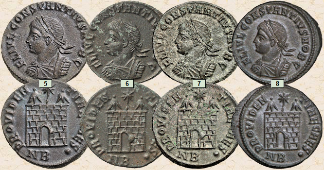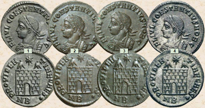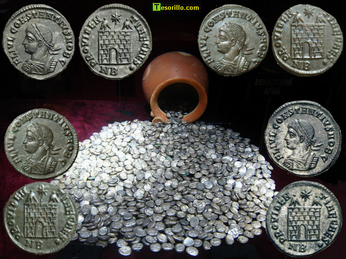 Sobre una fotografía del tesorillo de Elmali [1], que en 2010 se encontraba expuesto en el Museo del Antalya (Turquía), he colocado cuatro curiosas monedas del Bajo Imperio romano que tienen la particularidad de ser todas ellas extremadamente parecidas. ¿Sabrías decirme porqué son tan iguales? ¿Serán simples copias (monedas falsas)?