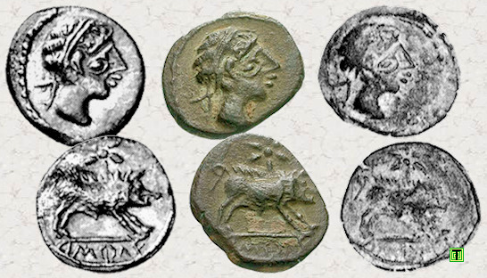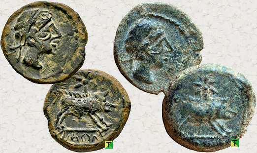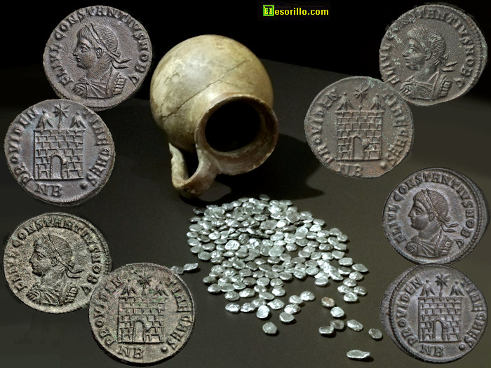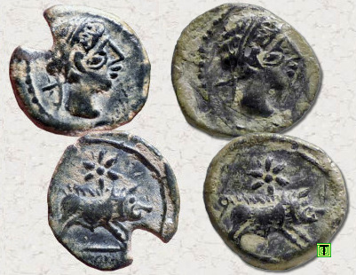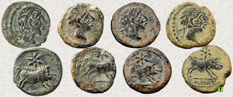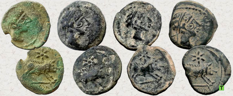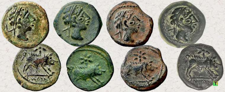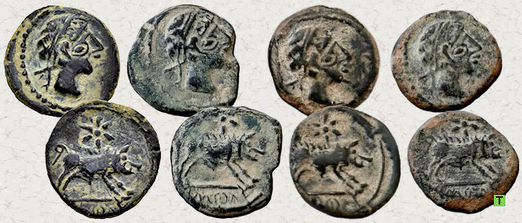 Sobre una imagen del tesoro de la neápolis de Ampurias [2], que en 2017 se encontraba expuesto en el Museo Arqueológico Nacional (Madrid), he colocado otras cuatro monedas que son muy parecidas entre ellas, pero que además coinciden con las cuatro anteriormente mostradas. Por lo tanto, repito las mismas preguntas. ¿Porqué son tan iguales? ¿Serán simples copias (monedas falsas)?