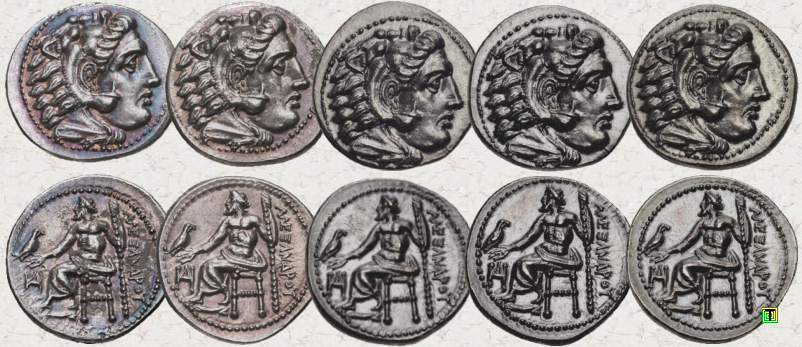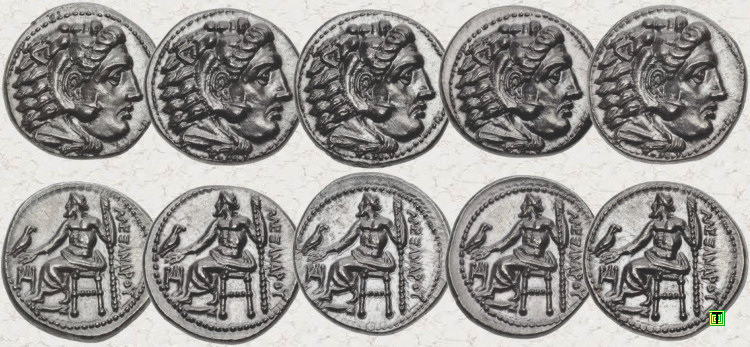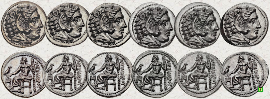 Finalizaré con dieciséis dracmas de Alejandro Magno que fueron acuñadas en Miletos (325-323 a.C.) y puede observarse claramente que comparten los cuños de ambas caras. Estas monedas fueron vendidas por CNG (Classical Numismatic Groupe) entre 2015 y 2017, destacando su similar estado de conservación y su idéntico aspecto, por lo que parece evidente que debieron de formar parte de un mismo hallazgo, de un supuesto tesorillo. (Ver tesoro de Sinanpaşa). Ver CNG: 1 - 2 - 3 - 4 - 5 - 6 - 7 - 8 - 9 - 10 - 11 - 12 - 13 - 14 - 15 - 16