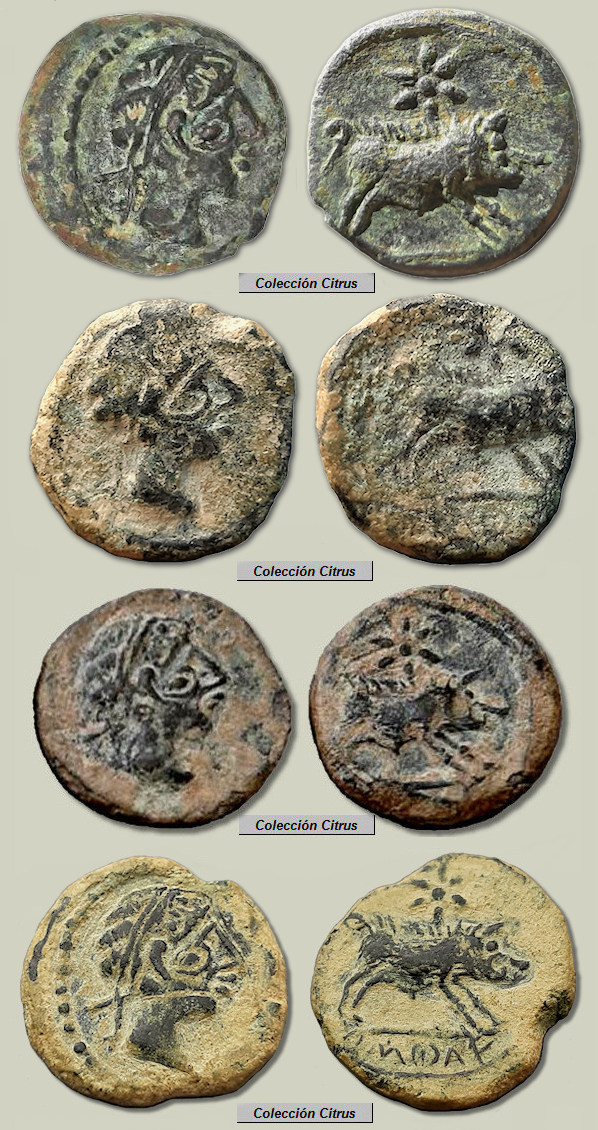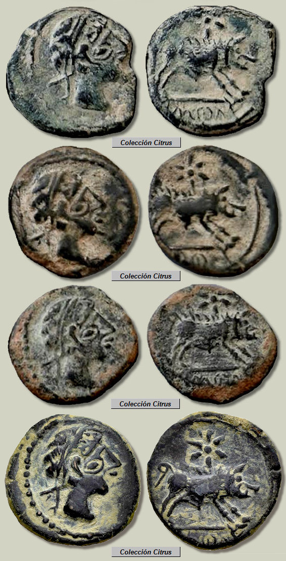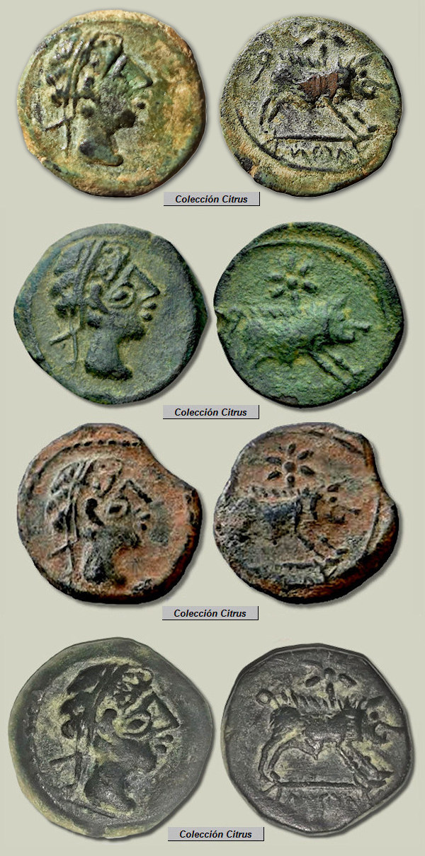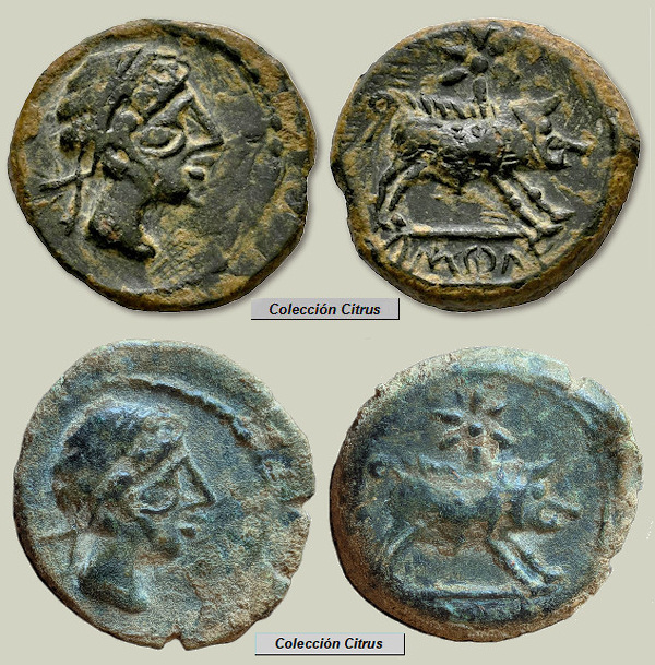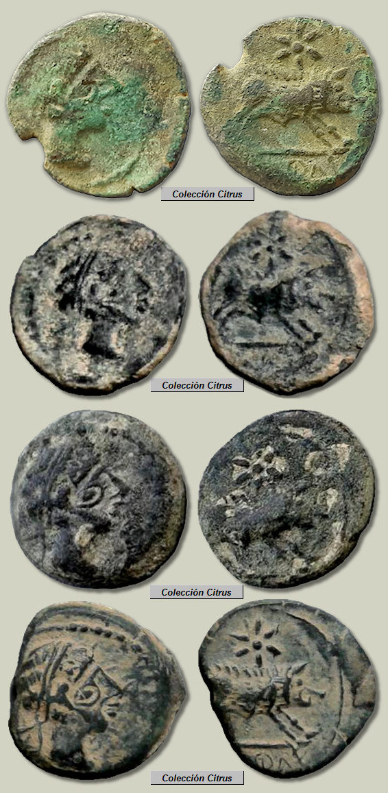 Los 27 divisores (cuartos) que figuran más abajo tampoco formaron parte de un hallazgo conjunto, siendo destacable que los últimos 18 ejemplares pertenecen a una misma colección, a la colección "Citrus". Estas monedas fueron acuñadas en Hispania Ulterior, en la ceca ibérica de ka.ś.ti.lo. (Castulo) a finales del siglo III a.C. (alrededor de los años 220-206 a.C.) y como se ve, todas ellas proceden del mismo par de cuños. A pesar de que aquí podemos ver muchos ejemplares en realidad estas son monedas bastantes raras, monedas que no recoge L. Villaronga en su Corpus (CNH: Madrid, 1994) ni tampoco en su actualización (ACIP: Barcelona, 2011). Citadas como inéditas en la página 256 del libro de la colección G. Cores (Valencia, 2017), actualmente ya se encuentran catalogadas en el MIB con el nº 15537. En todas estas monedas destaca el curioso diseño de un "segundo ojo" en el busto del anverso, ojo que recuerda la amonedación celta y podríamos denominar como "picassiano".
