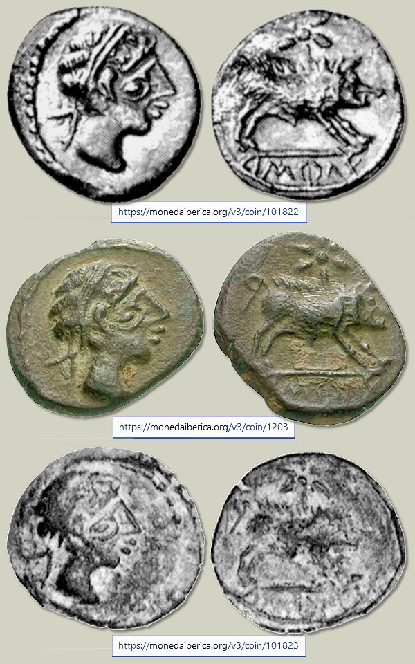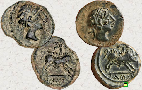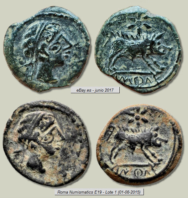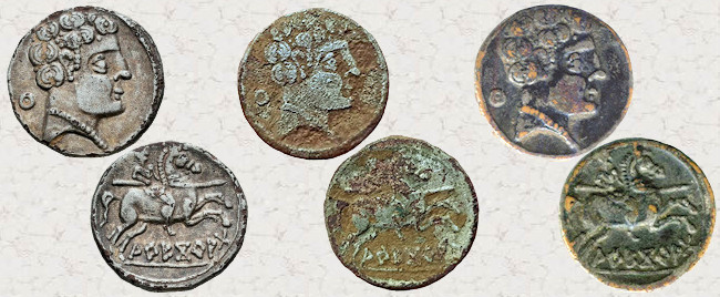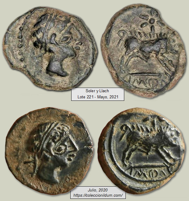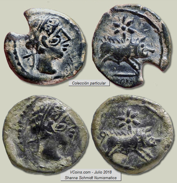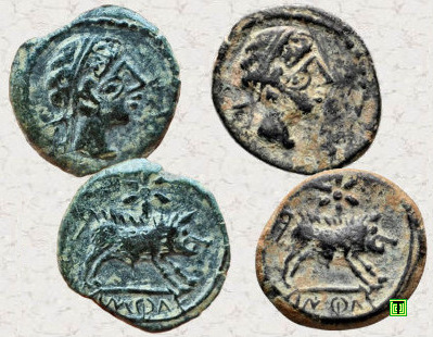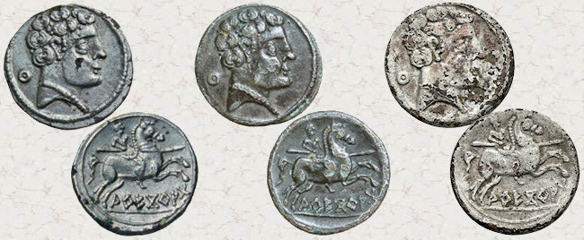 Si complicado resulta encontrar ocho monedas con cuños coincidentes como las de Constancio II mostradas anteriormente, los ejemplos siguientes son ya para nota. He encontrado seis denarios ibéricos forrados de a.ŕ.e.ko.ŕ.a.ta (Arekoratas), veintiséis divisores de ka.ś.ti.lo (Castulo) y dieciséis dracmas de Alejandro Magno que presentan la curiosa particularidad de haber sido acuñadas con los mismos cuños, tanto de anverso como de reverso. Los seis denarios forrados mostrados a continuación son de diversa procedencia por lo que no creo que formaran parte de ningún tesorillo. Estas monedas fueron acuñadas en Hispania Citerior a principios del siglo I a.C., imitando las emisiones de la ceca berona de a.ŕ.e.ko.ŕ.a.ta (Arekoratas). Resulta increíble que una vez dispersados hayan llegado hasta nuestros días y yo haya conseguido agruparlos de nuevo. ¿No? Ver artículo: "Algunos denarios forrados singulares".