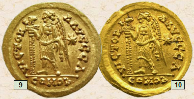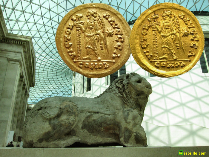 Es importante aprender a distinguir entre los denominados "clones", monedas fundidas exactamente iguales y por lo tanto falsas, y las "monedas gemelas", monedas genuinas que fueron acuñadas con los mismos cuños por lo que incluso nos pueden servir para certificar la autenticidad de una pieza. En la siguiente foto de la entrada al Museo Británico de Londres he colocado dos monedas ostrogodas de oro que tienen idénticos reversos. Qué opinas... ¿son falsas o auténticas?