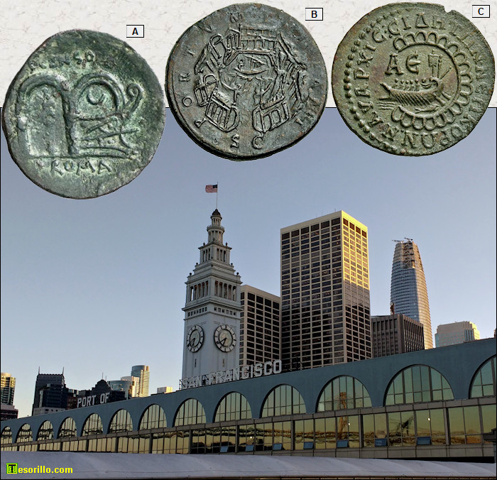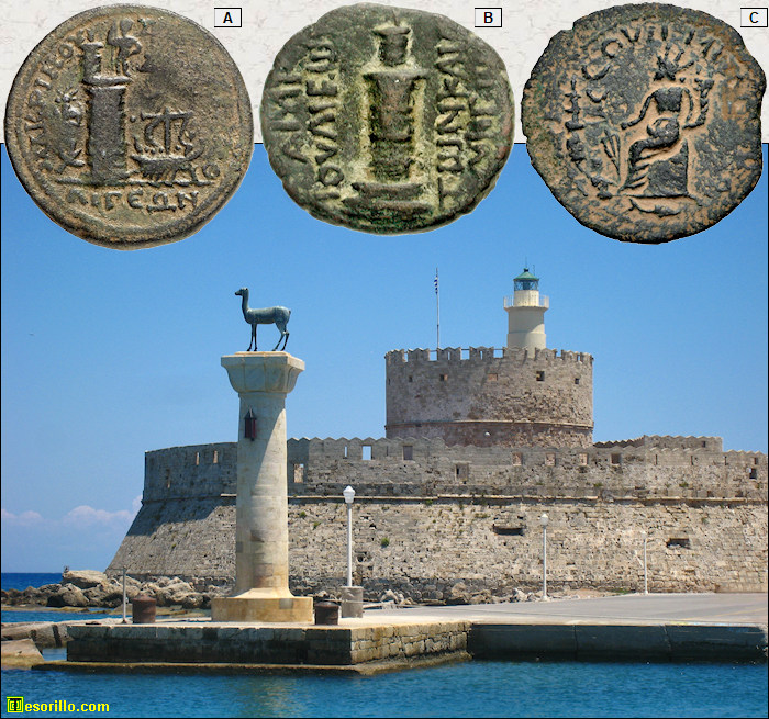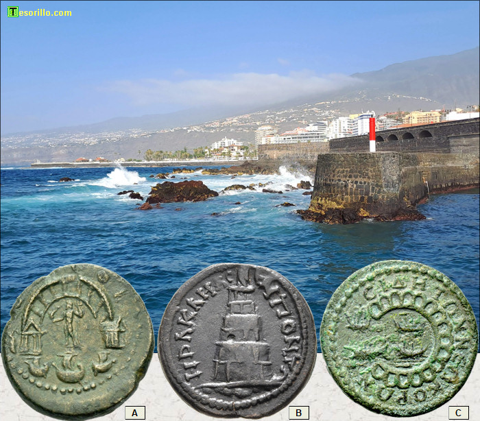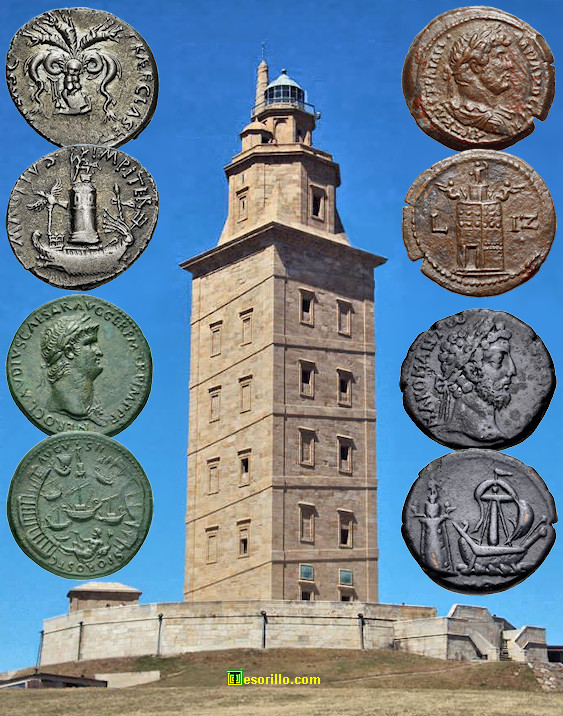 A lo largo de varios siglos los romanos -y en contadas ocasiones los griegos- representaron algunos de sus emblemáticos faros y también sus puertos en las monedas, siendo normalmente acuñaciones tan bellas como raras y por lo tanto poco asequibles para el coleccionista medio. Sobre una fotografía de la Torre de Hércules (La Coruña, 2012), faro que data de tiempos romanos (Farum Brigantium, siglo I d.C.) y tiene el privilegio de ser el más antiguo del mundo que está aún en funcionamiento, he distribuido cuatro monedas romanas con representaciones de diferentes faros y también del puerto de Ostia (Roma). Dos de estas monedas representan una torre que fue construida a mediados del siglo III a.C. en la isla de Faro, construcción que sería tan relevante que el nombre de dicha isla pasó a denominar a todas las torres similares que después se levantarían a lo largo y ancho del mundo. En otras palabras: φάρος / pharos en griego, pharus en latín, faro en español e italiano, farol en portugués, etc. Dime entonces: ¿A qué monedas me refiero y en qué ciudad fueron acuñadas?