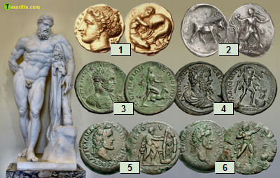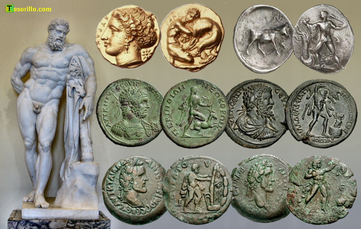 Pocas monedas antiguas son tan anheladas por los coleccionistas como las de los "Trabajos de Hércules", pero son monedas suficientemente raras (y caras) para que estén fuera del alcance de la mayoría de nuestros bolsillos. Nos conformaremos con las fotos, pues. (En los links se puede ver la procedencia de las imágenes). Al lado de la imagen de una estatua de Heracles (o de Hércules, su equivalente romano) del museo del Hermitage de San Petersburgo (Rusia), he colocado seis monedas que representan los primeros seis trabajos de Hércules, dos de ellas son dracmas, ¿sabrías identificarlas?