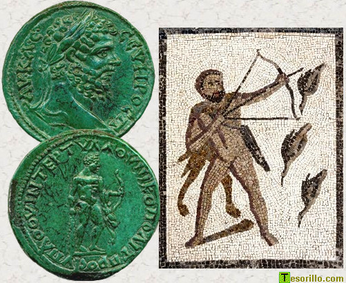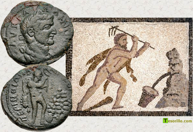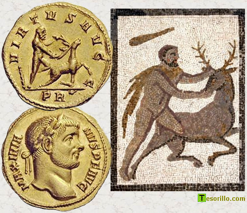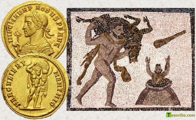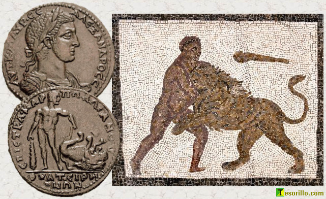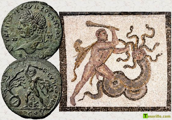 Las representaciones de los Trabajos de Hércules en monedas antiguas son tan espectaculares que no me resisto a añadir algunos ejemplos más, aprovechando el no menos espectacular mosaico romano de Liria (Valencia) que se encuentra expuesto en el Museo Arqueológico Nacional de Madrid.