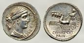 Moneda de plata acuñada en Roma (58 a.C.) por P. Plautius Hypsaeus y M. Aemilius Scaurus.