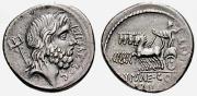 Moneda de plata acuñada en Roma (47 a.C.) por el magistrado monetal Lucius Plautius Plancus.