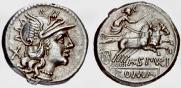 Familia totalmente desconocida, incluso Crawford sugiere Spurius o Spurinna como posibles alternativas a Spurillia. Este denario junto a un triens con la misma leyenda (A. SPVRI ) constituyen toda su amonedación. Nota) existen otros denarios con la leyenda A. SPVRI que muestran una Victoria en lugar de Luna y la marca XVI en vez de X, pero al parecer son siempre falsificaciones de época (denarios forrados) |