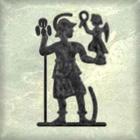 estante, de frente, cabeza hacia la derecha o de frente, portando trofeo y Victoria sobre globo.