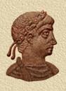 Securitas estante a la derecha, con las piernas cruzadas, portando cetro y