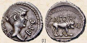 Periodo I Fundada en 43 a.C. por Munatius Plancus, la colonia Copia Felix Munatia Lugdunum emitió inicialmente series locales en plata y bronce, a nombre de los triunviros Marco Antonio y Octavio (RPC 511-516). [1] Quinario / Lugdunum / Marco Antonio (Dr. Busso Peus Nachfolger) |