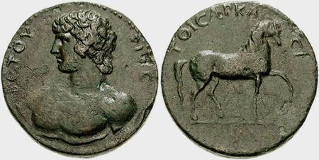 Reverso: Antinoo a caballo, llevando las riendas con su