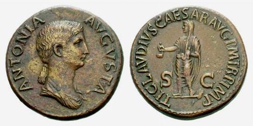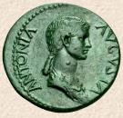 Antonia fue la hija menor de Marco Antonio y Octavia. También ha sido denominada como "Antonia la Menor". Nació alrededor del año 36 a.C. y se casó con un hermano del emperador Tiberio, Nerón Claudio Druso "el Germánico" hacia el 16 a.C. con quien tuvo 3 hijos: Claudio I, Germánico y Livia. Vivió lo suficiente como para conocer a su nieto Calígula, que fue proclamado emperador el 37 d.C. Calígula la confirió en un principio numerosos honores, pero perdió pronto su favor, muriendo el 37-38 d.C. envenenada (casi con seguridad) por orden del propio emperador. Todas las monedas acuñadas con su efigie y su nombre, lo fueron durante el período de gobierno de su hijo Claudio, posiblemente en los inicios de su mandato.