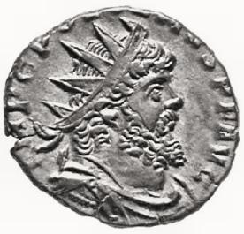Busto barbado de Póstumo, con corona radiada y túnica, hacia la
