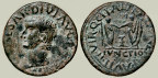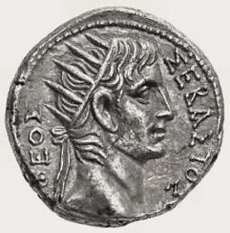 Busto de Augusto con corona radiada, mirando hacia la derecha. Estrella en la parte superior del campo y haz de rayos a la derecha.