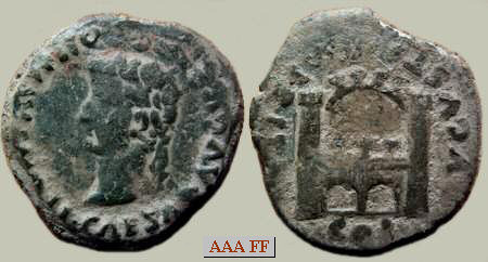 Reverso: AVGVSTA / EMERITA escrito en dos líneas sobre la puerta de la ciudad.