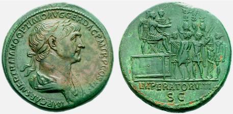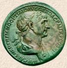 Marco Ulpio Trajano (53-117 d.C.), emperador romano (98-117 d.C.), conquistador de la Dacia y Mesopotamia, y primer emperador romano de origen hispano, gobernó con el nombre de César Divino hijo de Nerva, Nerva Trajano Optimo Augusto y también fue llamado César Nerva Trajano Germánico. Nacido en Itálica (cerca de la actual Sevilla, en la Bética), lo más probable es que su familia fuera de origen romano. De joven se instruyó en el Ejército romano y tomó parte activa en las campañas de Hispania, Siria y Germania, durante los reinados de los emperadores Tito y Domiciano. Se distinguió como general de inteligencia excepcional, y en el 91 fue elegido cónsul. En el 97, el emperador Nerva le adoptó y asoció al Imperio. A la muerte de Nerva, un año después, Trajano, que estaba inspeccionando la frontera romana en Germania, le sucedió como emperador. Sin embargo, no regresó a Roma hasta algunos años más tarde haciendo entonces una entrada triunfal -acompañado de su esposa Plotina- siendo aclamado por la multitud por sus virtudes de modestia y nobleza de espíritu. Celebró su entronización dando gratificaciones a sus soldados y también asegurando la manutención de los hijos de los hombres libres pobres en Roma y otras ciudades italianas; de esta manera continuó con el sistema de generosidad gubernativa iniciado por Nerva. En el 101, emprendió su primera campaña contra los dacios, en el sureste de Europa. La lucha fue larga y feroz, pero hacia el 106, los romanos habían sometido a todo el país, que se convirtió en la provincia romana de Dacia. Esta conquista se celebró con juegos que duraron cuatro meses. Se levantó la famosa Columna Trajana en el Foro de Trajano, en Roma (106-113 d.C.), para conmemorar la victoria. En el año 113 d.C., el emperador dirigió una gran expedición a Oriente contra los partos. Desembarcó en Siria, anexionó Armenia y el norte de Mesopotamia como provincias romanas, conquistó Ctesifonte, la capital parta en el río Tigris, y avanzó hasta el golfo Pérsico. En este punto, los judíos de Mesopotamia aprovecharon el aislamiento del emperador para rebelarse. Regresó a Roma, pero murió de camino en Selinonte, en la provincia romana de Cilicia. Plotina, que había acompañado a su esposo en su última expedición, regresó a Roma con una urna de oro conteniendo sus cenizas y los imperiales restos fueron depositados en la columna Trajana. Plotina no tuvo descendencia, pero influyó en la decisión de Trajano -poco antes de morir- de adoptar como heredero a Adriano, por quién Plotina sentía una gran estimación. A pesar de que pasó la mayor parte de su reinado ocupado en las campañas militares, realizó diversas reformas administrativas. Se construyeron vías nuevas, canales y puentes, se restauró la vía Apia, se desecó parte de la llanura Pontina, y se levantó el magnífico Foro de Trajano, en Roma. En Italia, se construyó el puerto de Centum Cellae (la actual Civitavecchia), y en la provincia romana de Numidia, en el norte de África, se fundó la ciudad de Timgad. Sus numerosas construcciones públicas debilitaron las arcas imperiales, pero contó con el apoyo del Senado. Hacia los cristianos demostró una actitud intransigente, pero no promovió ninguna persecución.