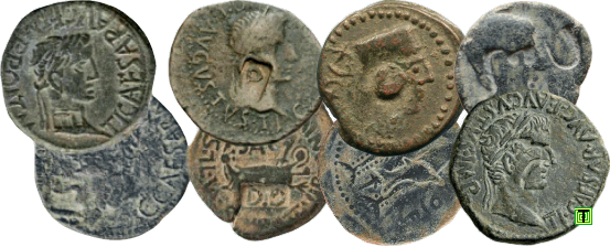 Las monedas romanas contramarcadas son en su mayoría unidades/ases pertenecientes a Augusto y Tiberio, y en