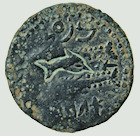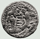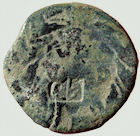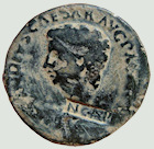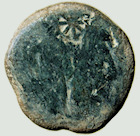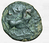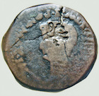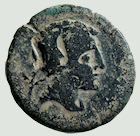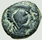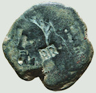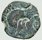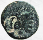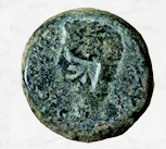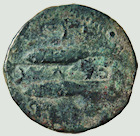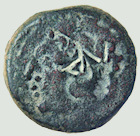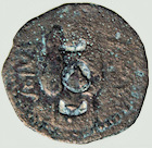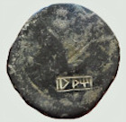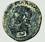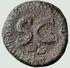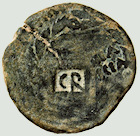 Solamente he encontrado documentada una contramarca con supuestos caracteres griegos (RPC 96) en las monedas de Hispania. Ver el resello que parece corresponder a la letra épsilon o el numeral griego cinco (Є) en la moneda mostrada a la derecha. Normalmente las contramarcas se estampan sobre los ases, aunque en ocasiones podemos encontrar algún resello sobre sestercios, dupondios o semises. (Este cuadrante de Emerita constituye sin duda una excepción). Las últimas contramarcas sobre monedas hispanorromanas corresponden a la época de Nerón, cuando todas las cecas hispanas ya habían sido cerradas. |