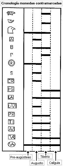 La estampación de contramarcas y marcas sobre las monedas de bronce es un fenómeno común en el mundo antiguo del que no fue ajeno la abundante amonedación de Hispania Antigua. (Ver: "Marcas, contramarcas y reacuñaciones en las monedas de la Antigüedad"). El contramarcado es una forma rápida y barata de convertir monedas foráneas en propias, reteniendo las piezas para circular en el ámbito del que las resella. En otros casos fue una operación para devaluar o legalizar piezas muy gastadas, ya que el valor de una moneda puede verse modificado o su uso revalidado mediante estos resellos; pero la función del contramarcado debió ser mucho más amplia, hay multitud de contramarcas y marcas presentes en Hispania (hay más 350 tipos) y de muchas de ellas no conocemos su origen, ni su función o significado. De todos los periodos monetarios de la Hispania romana, es durante la dinastía Julio-Claudia cuando se observa la mayor variedad y cantidad de monedas contramarcadas, sin duda debido al cierre de las cecas occidentales, ya que el suministro de moneda fue decreciendo paulatinamente entre los reinados de Augusto y Claudio. Ver cronología de las monedas provinciales romanas de Hispania sobre las que aparecen algunas de las contramarcas más frecuentes. Es de destacar que similar fenómeno se dio en el resto de las Provincias limítrofes del Imperio.