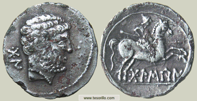 Anverso: cabeza de Mercurio tocada con petaso alado.