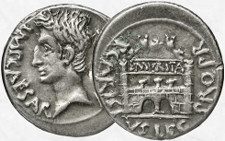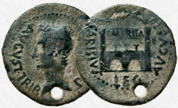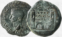 A. Cabeza desnuda de Augusto, mirando hacia la derecha. R. Puerta y muralla circular de la ciudad. |