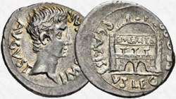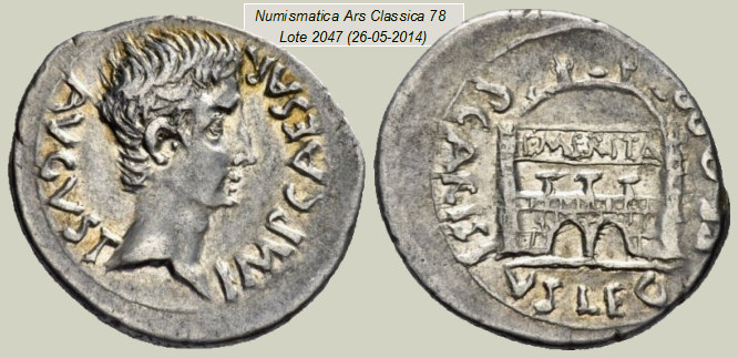 monedas imperiales emitidas entre los años 25 y 23 a.C. (tanto en plata como en bronce/oricalco) a nombre de Augusto. El segundo y tercer grupo corresponden con las