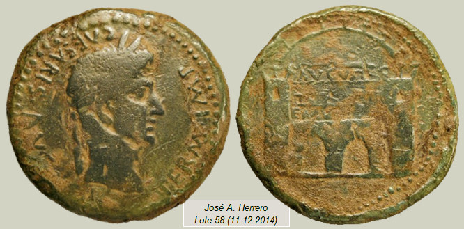 A. Cabeza laureada de Tiberio, a izquierda. R. Puerta y muralla circular de la ciudad. |