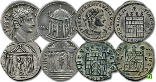 Las representaciones arquitectónicas en las monedas de los periodos citados son reducidas,