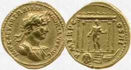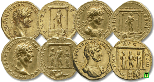 Existen seis tipos de áureos con el templo de Gades (RIC II 56-61), con diversas representaciones que incluyen, además de la figura de Hércules, desnudo, dentro de un templo y portando maza y/o manzanas (¿de oro?), a una divinidad acuífera (¿Océano?), dos figuras femeninas (¿Hespérides?), una cabeza frontal (¿máscara?), el busto de Júpiter, la proa de barco y un pez. Dividiremos estas monedas en dos grupos, según el número de columnas del templo: