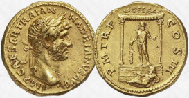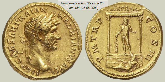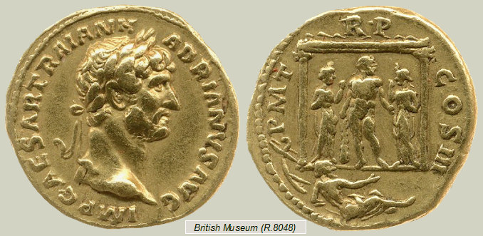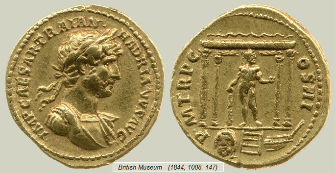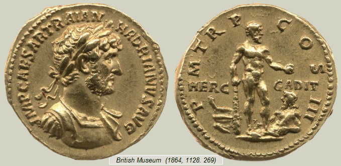 En tiempos de Adriano (119-122 d.C.), se emitieron en Roma unas emblemáticas monedas (ver áureo del British Museum mostrado a la derecha) en las que se representa a Hércules con la leyenda HERC GADIT (Hercules Gaditanus o bien Herculi Gaditano). Estas monedas han permitido identificar el templo que aparece en otros áureos de Adriano con el templo de Hércules situado en Gades. No hay total acuerdo entre los autores, pero la ascendencia del emperador (su madre Domicia Paulina era una aristócrata de Gades), la coincidencia en la fecha (tercer consulado) y la repetición de alegorías (proa de barco y dios acuífero), así parece confirmarlo.