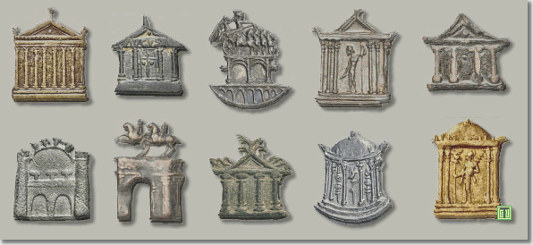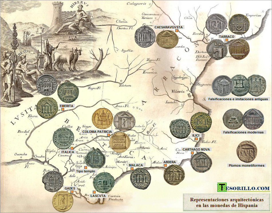 Grabado del padre Henrique Florez: "Medallas de las colonias, municipios y pueblos antiguos de España", parte I, p. 120a, (Madrid, 1757), sobre el que he colocado diversas monedas que fueron acuñadas en la antigua Hispania, entre los siglos II a.C. y IV d.C., con representaciones arquitectónicas (templos, altares, arcos, etc.) en su reverso. Haciendo clic en cada moneda se accede a información más detallada. El mapa muestra las cecas hispanas que acuñaron este tipo de "monedas arquitectónicas", sin olvidar los plomos monetiformes, las antiguas imitaciones, ni las sempiternas falsificaciones. |
