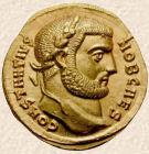 Flavio Valerio Constancio Cloro nació en Moesia Superior en 250, siendo sobrino-nieto de Claudio II, emperador muy querido en la época, lo que sin duda favoreció su ascenso al poder. Su nombre real era Iulius Constantius y el sobrenombre Chlorus se debe a la palidez de su semblante. En 288 fue Prefecto Pretoriano del emperador de Occidente Maximiano y en 293, fue ascendido bajo el sistema de La Tetrarquía al rango de César, encargándosele del gobierno de las Galias, Hispania y Britania. Para reforzar los lazos entre los cuatro gobernantes, en 293 Constancio desposó a Teodora (una hijastra de Maximiano) con la que tuvo una larga descendencia, separándose de su esposa Elena (lo más probable es que fuera simplemente su concubina, dada la diferencia de clases entre ambos, en todo caso con ella había tenido a su hijo, el futuro emperador Constantino el Grande). Al ser proclamado César recibió el encargo de sofocar la antigua rebelión de Britania (Maximiano llevaba años soportando la secesión), en 293 venció a Carausio y en 297 a Alecto y de esta forma incorporó de nuevo Britania al Imperio. Anteriormente había pacificado Las Galias y entre medias (298) repelió la invasión de los alemmani. Constancio I gobernó cerca de once años ostentando los siguientes títulos [1]: