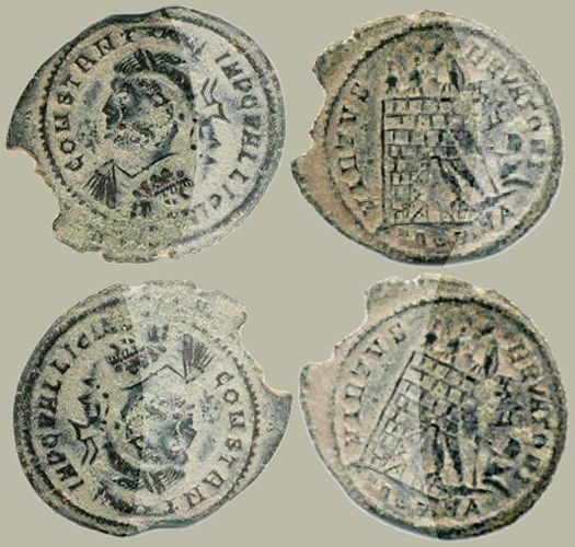 Graciano, pasando por Tétrico, Constancio II, Magno Máximo y otros emperadores. Normalmente eran piezas acuñadas con cuños falsos,
