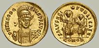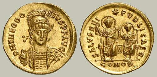 Teodosio II estante portando lanza y globo, flanqueado por los emperadores Honorio y Arcadio