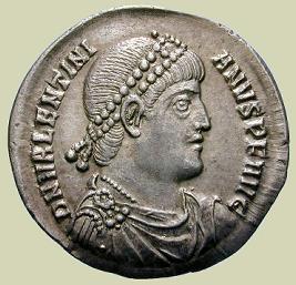 Valentiniano estante, de frente y mirando hacia la derecha, en