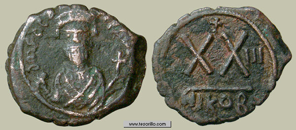 fue reacuñada sobre un medio follis anterior (normalmente de Mauricio Tiberio o Focas).